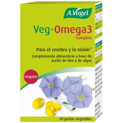 Veg-Omega 3 Complex de A. Vogel presentan cápsulas 100% vegetales elaboradas basándose en los aceites de semillas y microalgas de procedencia ecológica. Estos componentes proporcionan importantes elementos para la salud tales como ácidos grasos Omega-3 como DHA, ALA y EPA, que ayudan a mejorar el mantenimiento de nuestra salud física y mental.