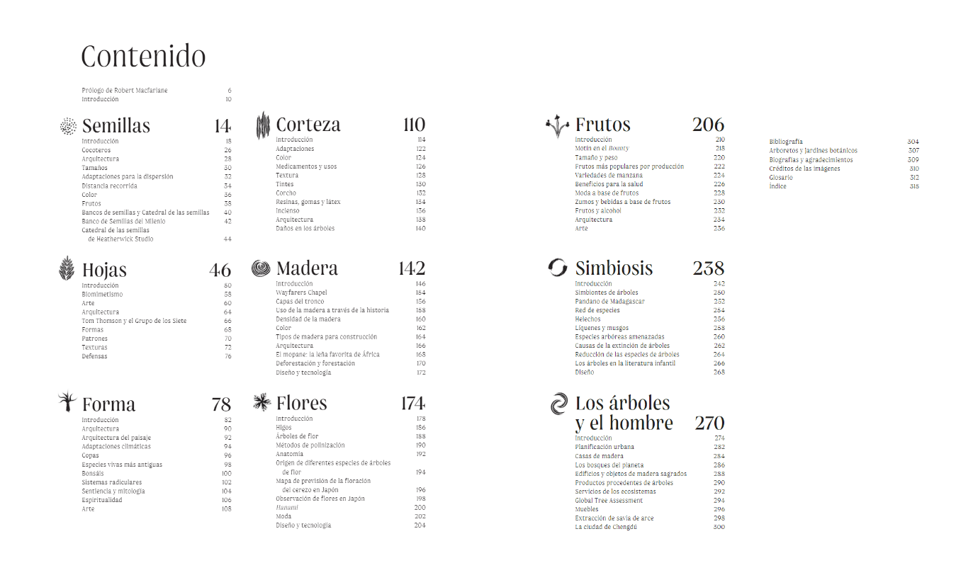 Los exquisitos detalles se plasman en fotografías e infografías sorprendentes: los intrincados patrones en las cortezas y las hojas, los ecosistemas entrelazados, la explosión de color de las flores, ruedas de madera arcaicas y casas de madera… Esenciales para la ciencia, el arte y cultura; fundamentales y frágiles; dependientes e imprescindibles, los árboles y su vitalidad se retratan en este libro como nunca habíamos visto.