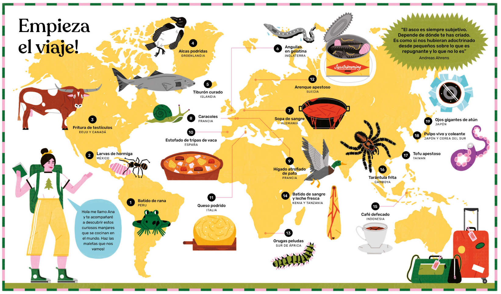 Acompaña a la protagonista del libro a descubrir las recetas típicas y los platos regionales más asquerosos del mundo. Un divertidísimo atlas por el asco y el mal gusto, en el que los lectores descubren que las comidas que gustan a unos dan asco a otros. Un canto a la diversidad, a las culturas gastronómicas tradicionales, al buen humor y a la audacia: ¿te lo comerías?