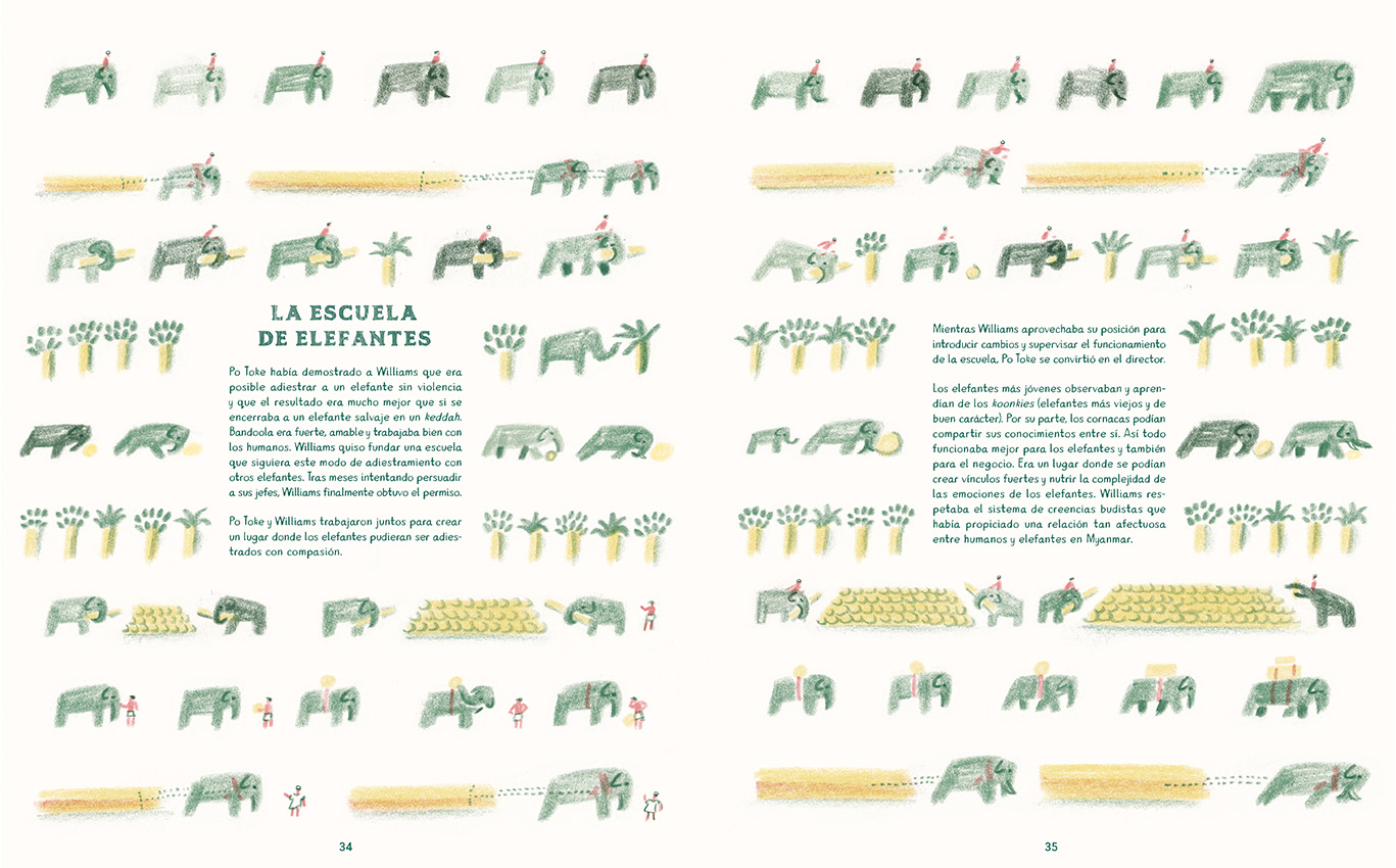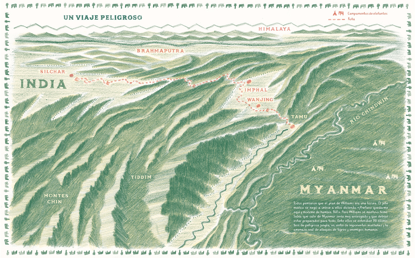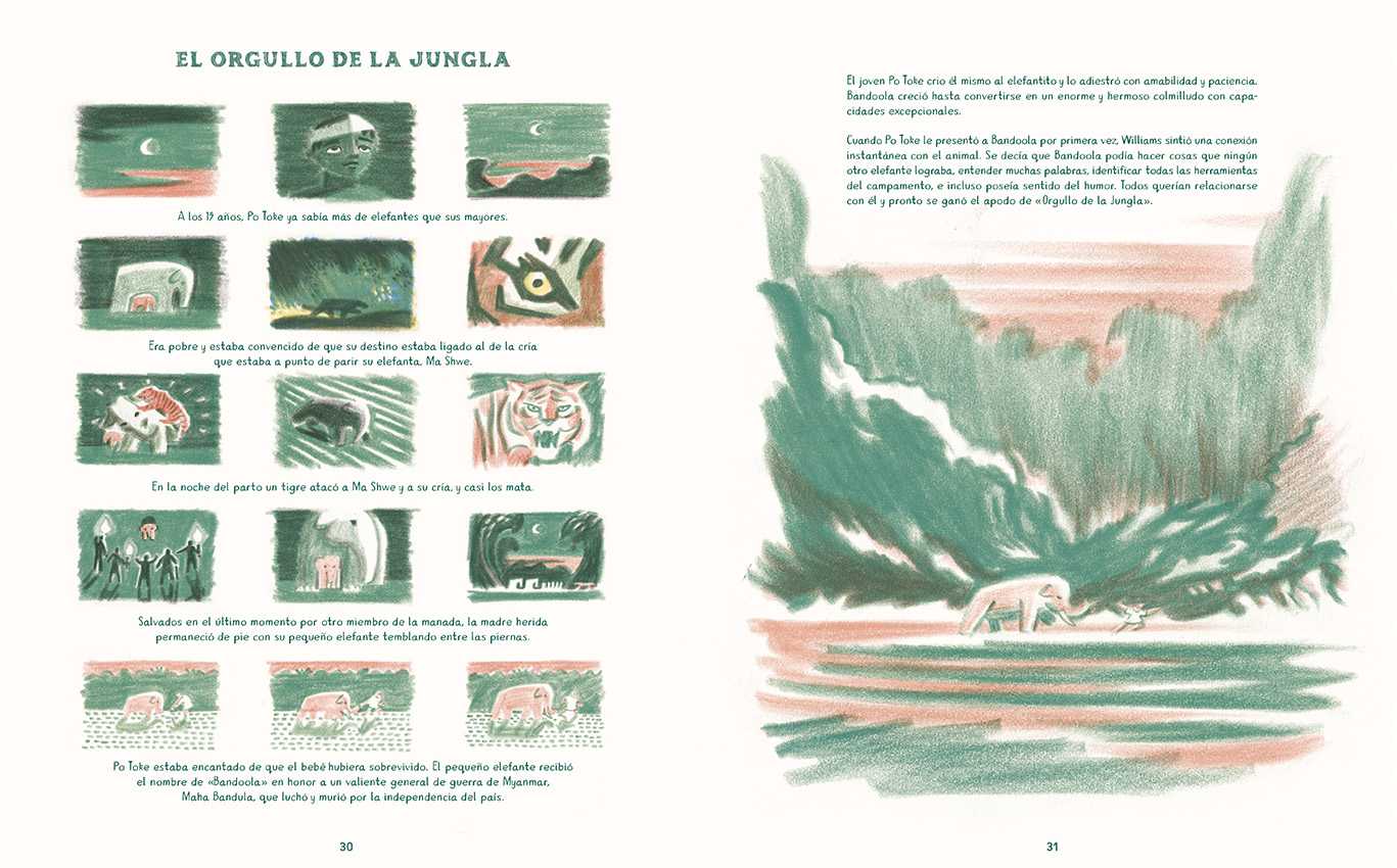 En Bandoola. El gran rescate de los elefantes, el aclamado William Grill rescata una historia real y nos transporta al majestuoso paisaje de la antigua Birmania, hoy Myanmar.