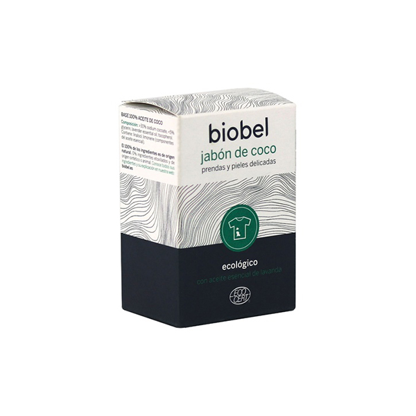 Eco Jabón de Coco con Lavanda de 240GR Biobel para Prendas Delicadas, es un producto sólido, pequeño y zero waste, es totalmente respetuoso con el medio ambiente. Esta pastilla de jabón con base 100% aceite de coco, facilita una eficaz limpieza de las prendas más delicadas eliminando las manchas más difíciles. Elaborado artesanalmente, aporta una abundante y cremosa espuma con perfume natural de aceite esencial de lavanda.