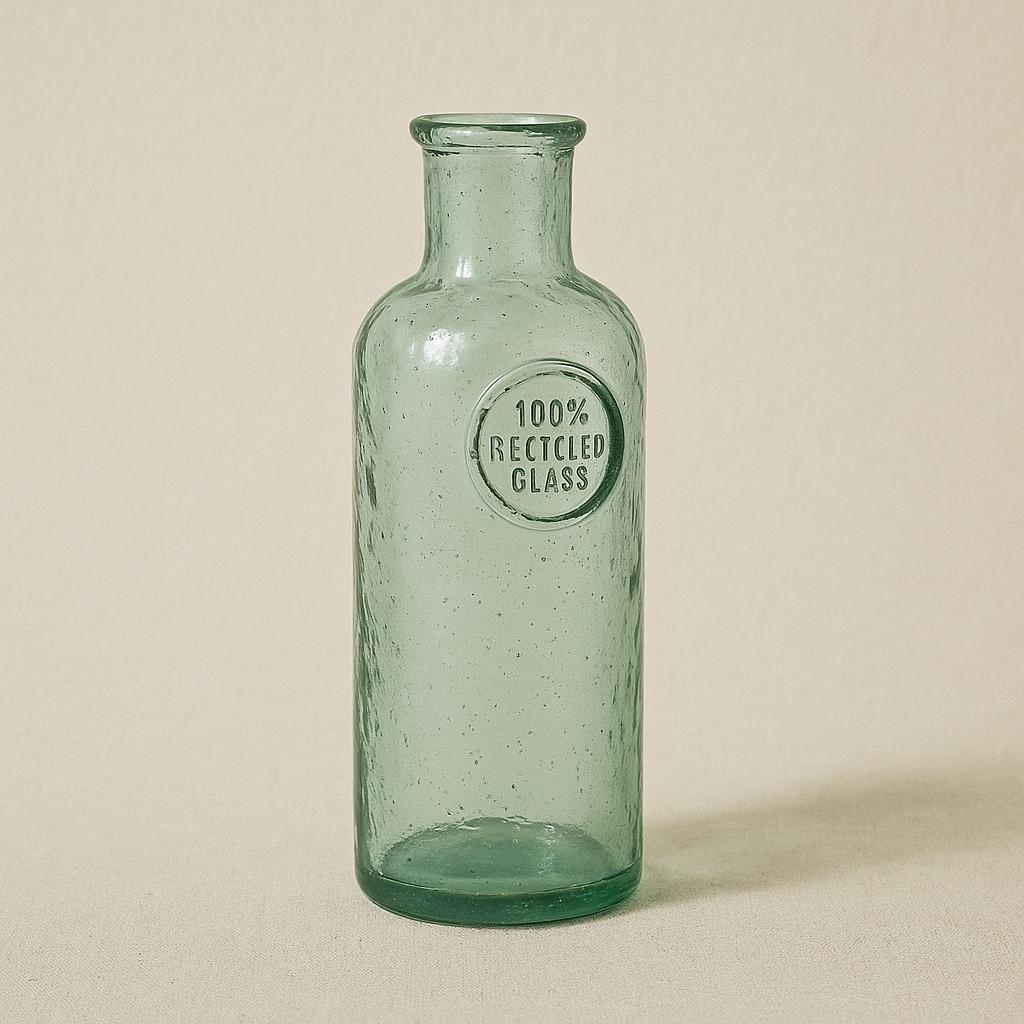 Esta elegante botella está fabricada artesanalmente con 100% vidrio reciclado, aportando un encanto natural y sostenible a cualquier espacio. Cada pieza es única, ya que el proceso manual de soplado puede dejar pequeñas burbujas, imperfecciones o ligeras variaciones de color, lo que le confiere un carácter auténtico y rústico 🌿