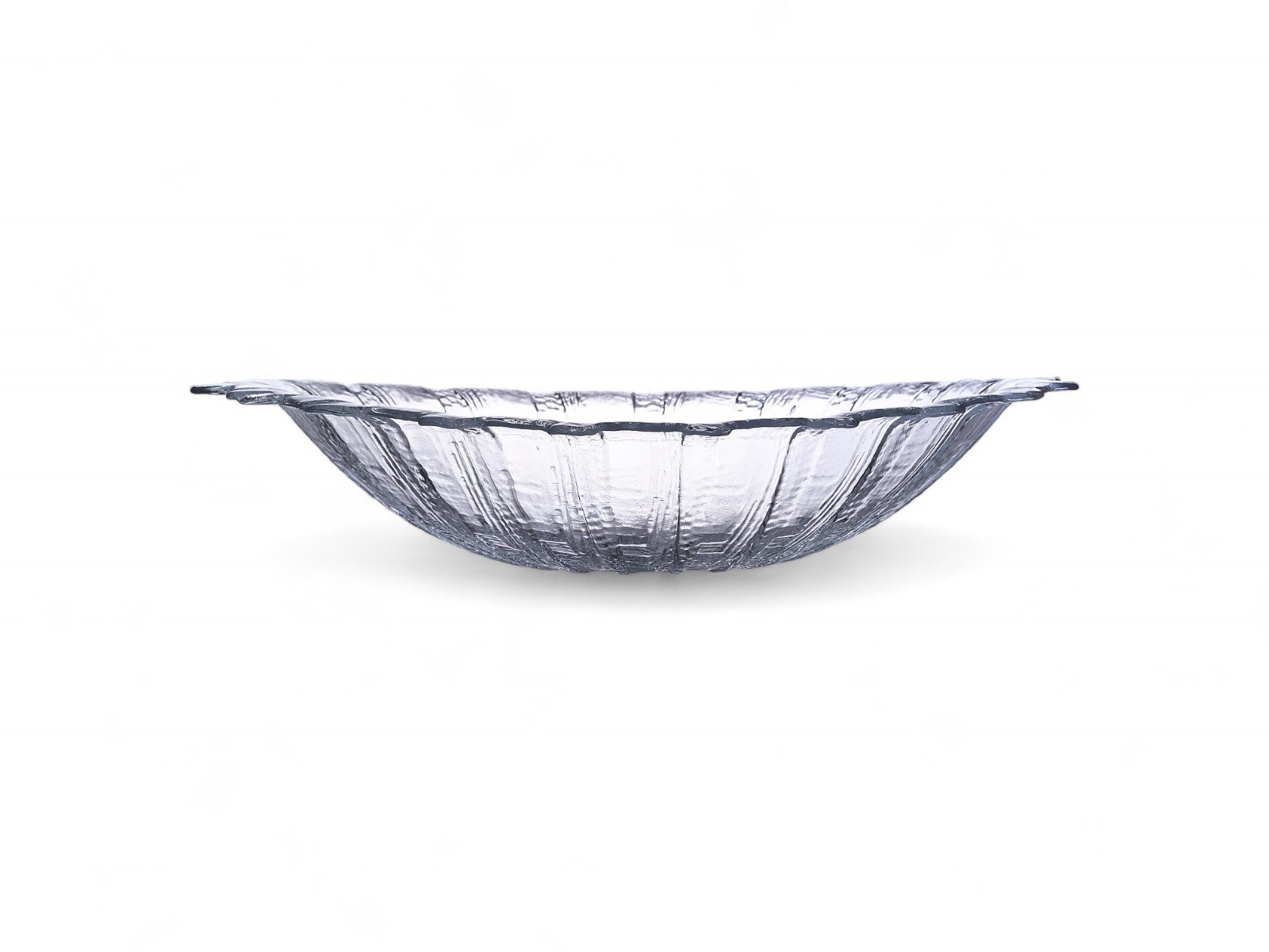Centro de mesa fabricado en cristal en forma oval con grabado «concha». Medidas 38cm por altura 10cm.