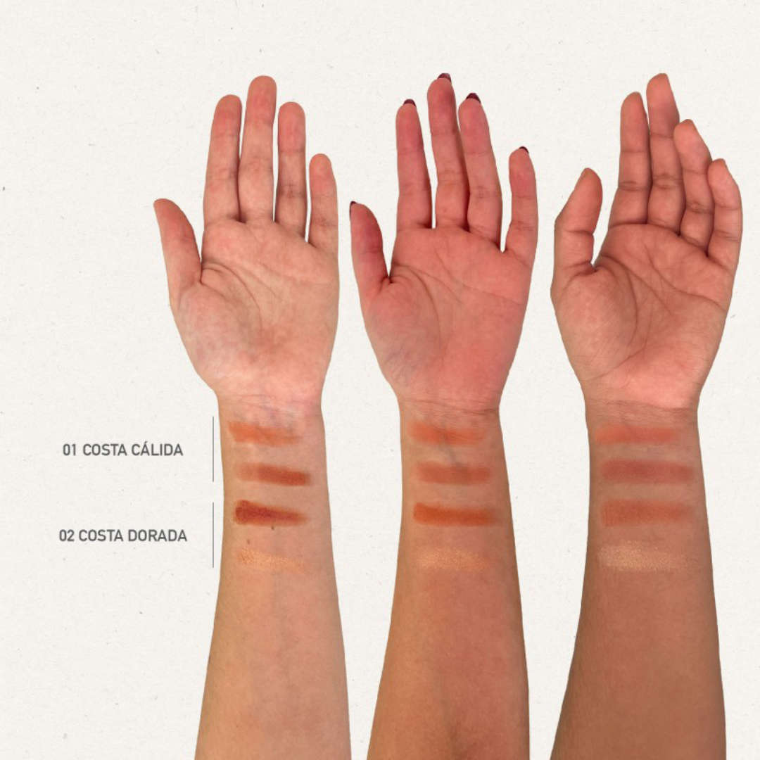 El Colorete Dúo 02 Costa Dorada está inspirado en los tonos bronce y terracota de las playas mediterráneas. Este dúo versátil realza la calidez natural del rostro, aportando definición y luminosidad en un solo gesto.
