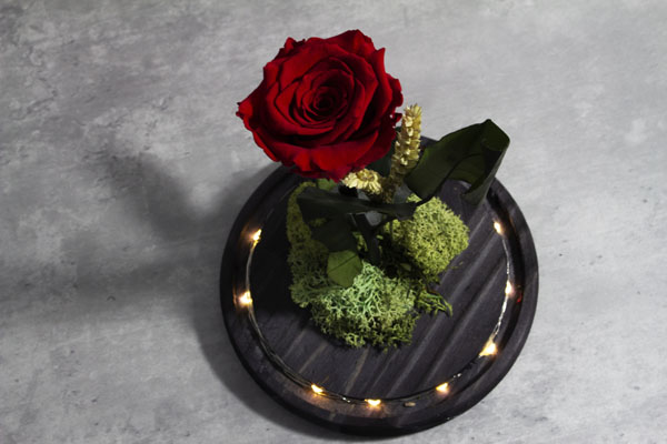 Ilumina tus sentimientos con esta Cúpula de Cristal de Ø15 H25, que alberga una Rosa Eterna Roja sobre una base de Madera Pino negra con luz LED. Una idea original para regalar en enamorados, fusionando pasión y luminosidad.