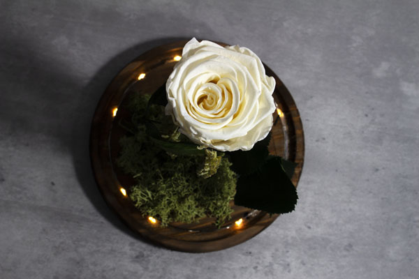 Embellece tu amor con esta Cúpula de Cristal de Ø15 H25, que resalta una Rosa Eterna Blanca con luz LED y una base de Madera Pino envejecida. Una idea original para regalar en momentos especiales, donde la luz y la pureza se conjugan.