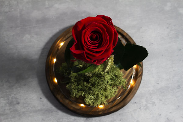 Resalta tu amor con esta Cúpula de Cristal de Ø15 H25, que presenta una Rosa Eterna Roja sobre una base de Madera Pino envejecida con luz LED. Una idea original para regalar en momentos especiales, donde la elegancia y la luz se conjugan.