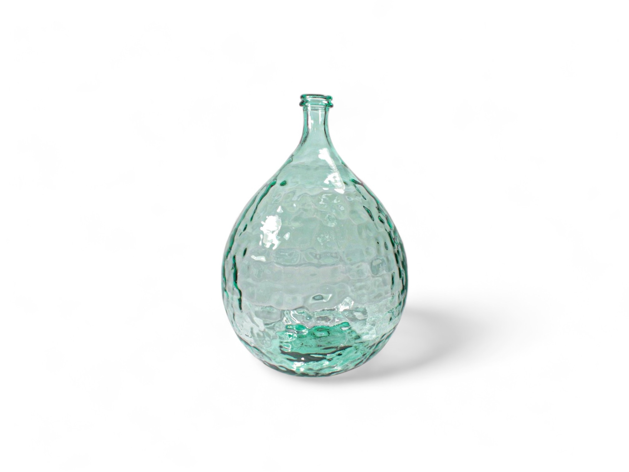 Damajuana decorativa jarrón modelo Valencia en diámetro 35 centímetros y altura 56 centímetros con una capacidad total de 34 litros. Fabricada por artesanos locales. Puede sufrir variaciones de color ya que es un articulo 100% realizado a mano y 100% reciclable.