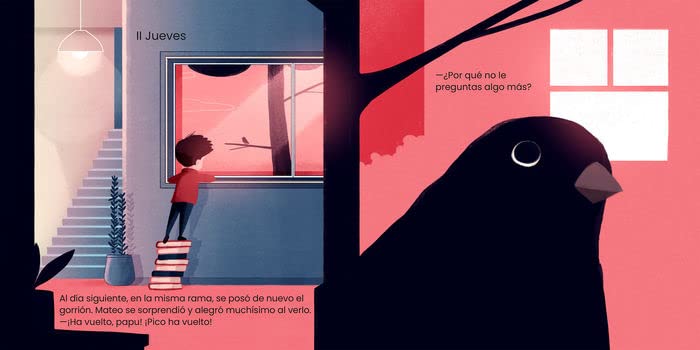Mateo vive entre dos casas, la de su padre y la de su madre. Más allá de la rutina del día a día pueden ocurrir cosas extraordinarias. Un día conoce a Pico, un gorrión que asoma a su ventana y que le cuenta a través del lenguaje de los pájaro.