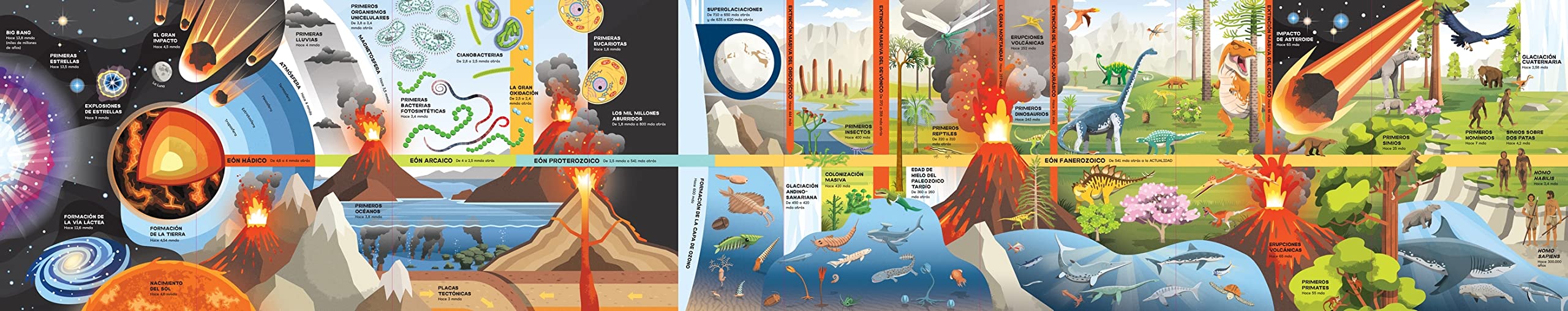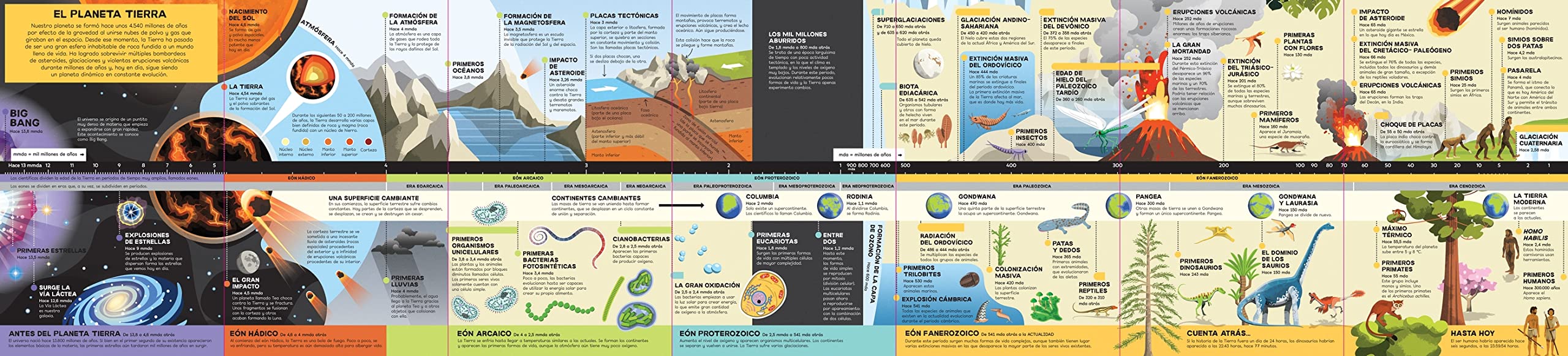 La historia de nuestro planeta, desde el Big Bang hasta nuestros días, en este gran desplegable a todo color con ilustraciones y una cronología de los hechos más importantes. En el reverso, los niños podrán ver información ilustrada sobre erupciones volcánicas de hace millones de años, eras glaciales, extinciones masivas y muchos más datos fascinantes sobre el planeta Tierra.