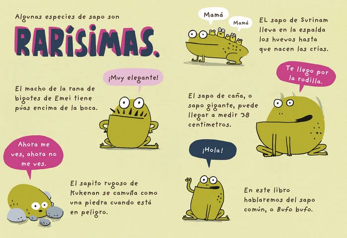 ¿Sabías que un sapo pone hasta 6.000 huevos de una vez? ¿Y que, si los atacan, echan veneno por la piel? Hay muchas clases de sapos y algunos pueden vivir en el agua, otros en tierra firme o incluso en las ramas de los árboles. Si te encuentras a un sapo significa que estás en un sitio limpio y sin contaminación, así que ¡podéis disfrutar juntos de la naturaleza!
