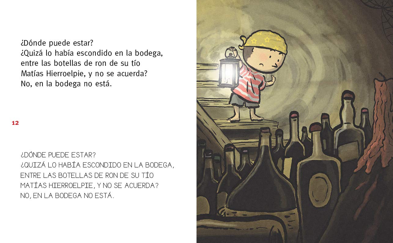 En cada página se encuentra el mismo texto: arriba en letra de imprenta y abajo en letra de PALO (mayúsculas). Permite trabajar la lectura en letra mayúscula y el cambio hacia la letra de imprenta. En la página de Editorial el Pirata se pueden descargar gratis recursos de este libro para mejorar y dinamizar la lectura (una propuesta didáctica, el solucionario, una actividad literaria de acertijos y ubicación espacial y un vídeo del ilustrador en el que habla del libro).