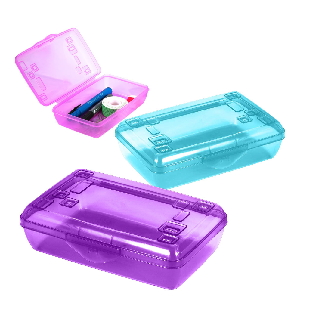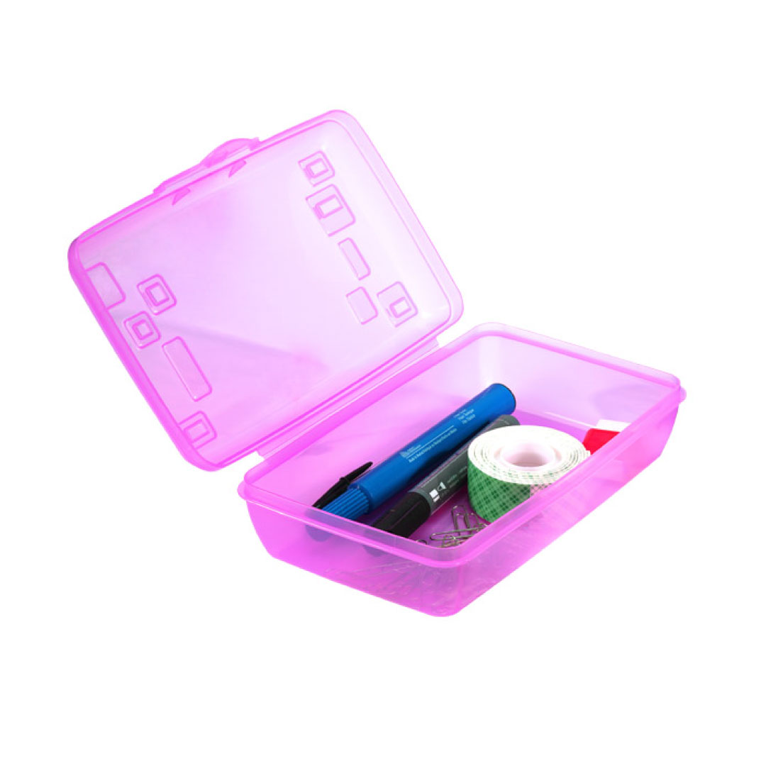 Estuche Básico Grande de Guateplast. Esta pequeña caja plástica es práctica y resistente que permite resguardar artículos pequeños, con tapadera ajustable. Este estuche guarda principalmente útiles escolares como lapiceros, lapices, marcadores, entre otros.