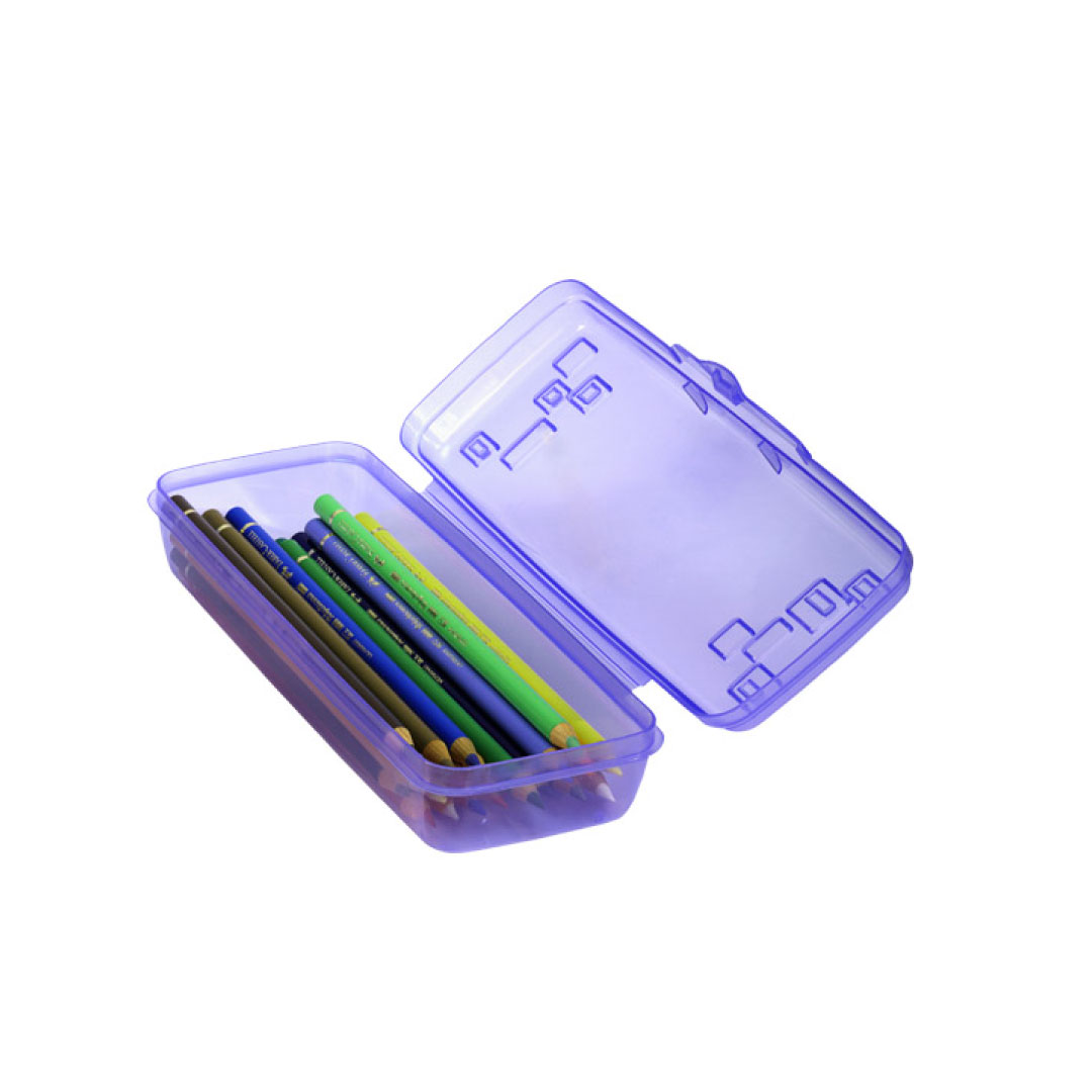 Estuche Básico de Guateplast. Esta pequeña caja plástica es práctica y resistente que permite resguardar artículos pequeños, con tapadera ajustable. Este estuche guarda principalmente útiles escolares como lapiceros, lápices, marcadores, entre otros.