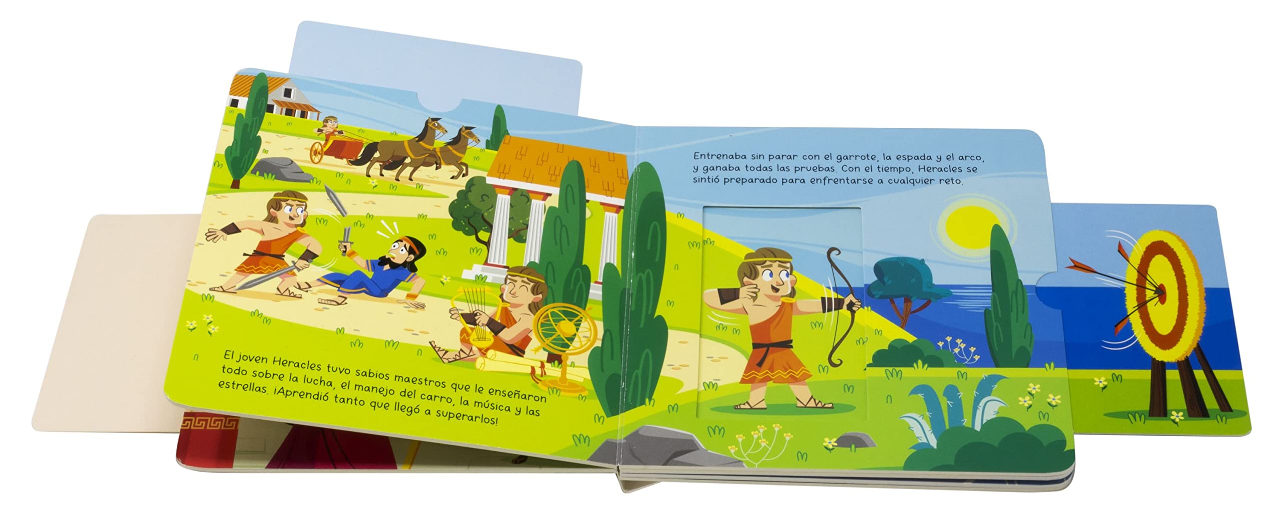En este libro interactivo del mito de Heracles encontrarás 8 páginas ilustradas con diferentes mecanismos para girar, deslizar, levantar y mover los personajes y objetos de la historia. Las criaturas seguirán el cuento con atención y se sumergirán todavía más en él al poder jugar con sus personajes. Por ejemplo, en este libro podrán derrotar al león de Nemea y hacer aparecer las cabezas de la hidra de Lerna.