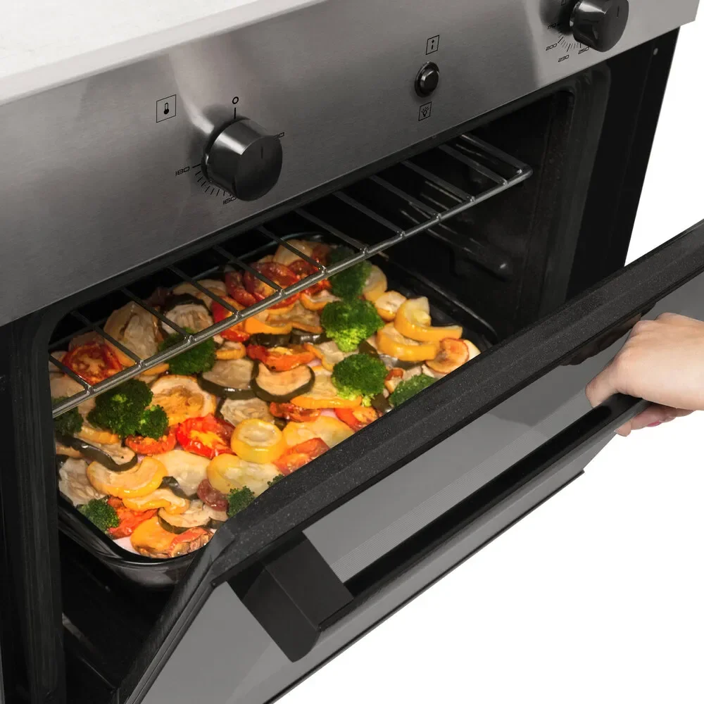 Horno a mixto con encendido electrónico, manija en acero inoxidable con disipador de calor, perilla ergonómico e iluminación interna. IMPORTANTE verificar dimensiones de ruteo: 56,8×58,7×56,5cm (Ancho x Alto x Profundidad)