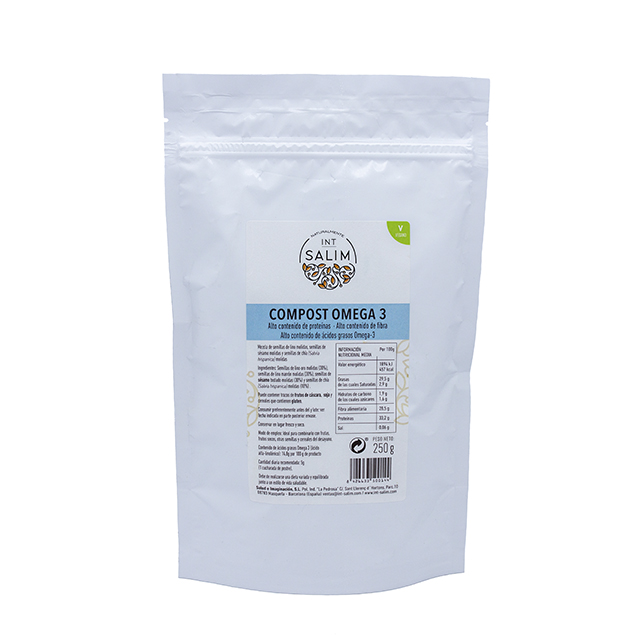 Compost Omega 3 de Int-Salim es una mezcla de semillas molidas, compuesta por dorado, lino marrón, y (Salvia hispánica). Esta mezcla ofrece excelentes beneficios para nuestra salud, debido a su alto contenido de proteínas, fibras y ácidos grasos, fundamentales para mantener en buena forma nuestro organismo. Además, todos estos elementos son de fácil absorción para nuestro cuerpo.