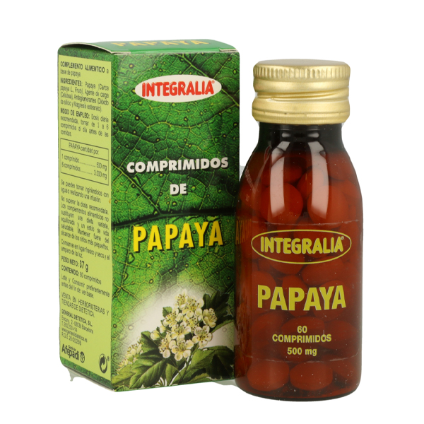 Papaya 60 Comp Integralia es un complemento nutricional con alto contenido en papaína, una enzima que ayuda a la digestión de los alimentos. Esta enzima es similar a la pepsina humana y desdobla las proteínas, lo que permite al organismo absorber mejor los nutrientes.