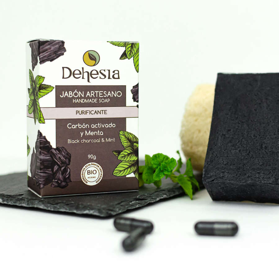 Jabón artesano y natural elaborado con carbón activo, aceite de oliva, manteca de karité y aceites esenciales de menta y eucalipto. Ideal para la limpieza diaria de las pieles con impurezas, espinillas y manchas en la piel por sus propiedades limpiadoras, purificantes y desintoxicantes de la piel.