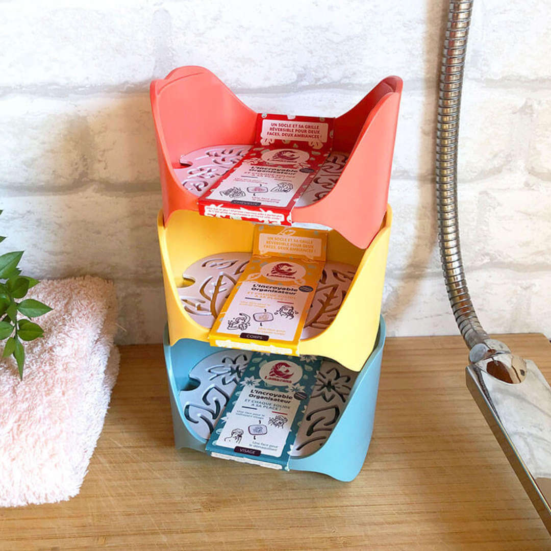 ¿Por qué no tener una colección de Organizadores Increíbles para almacenar todos sus productos sólidos? Puede colocarlos sobre una superficie, apilarlos o colgarlos. Simplemente use su imaginación y adáptelos a su baño y a sus hábitos.