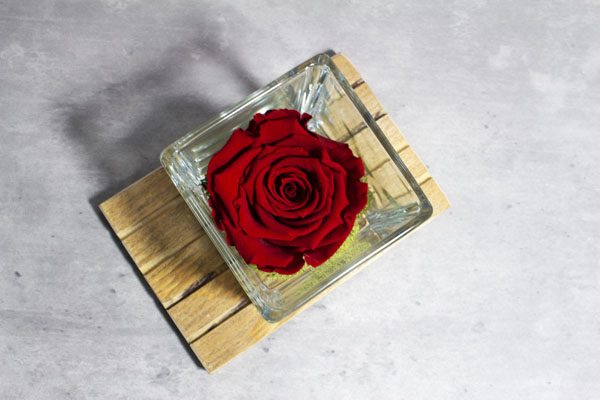 Eleva tus emociones con este Jarrón Cuadrado de 8x8x8, que abraza una Rosa Eterna Roja y musgo plano. Una idea original para regalar en momentos especiales, simbolizando amor eterno y naturaleza viva.