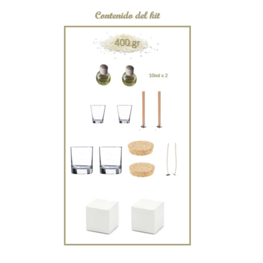 En este kit encontrarás todo lo necesario para poder fabricar 4 velas aromáticas: 2 medianas y 2 pequeñas.