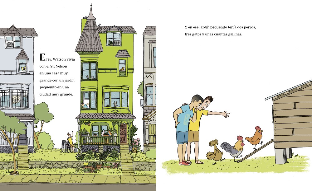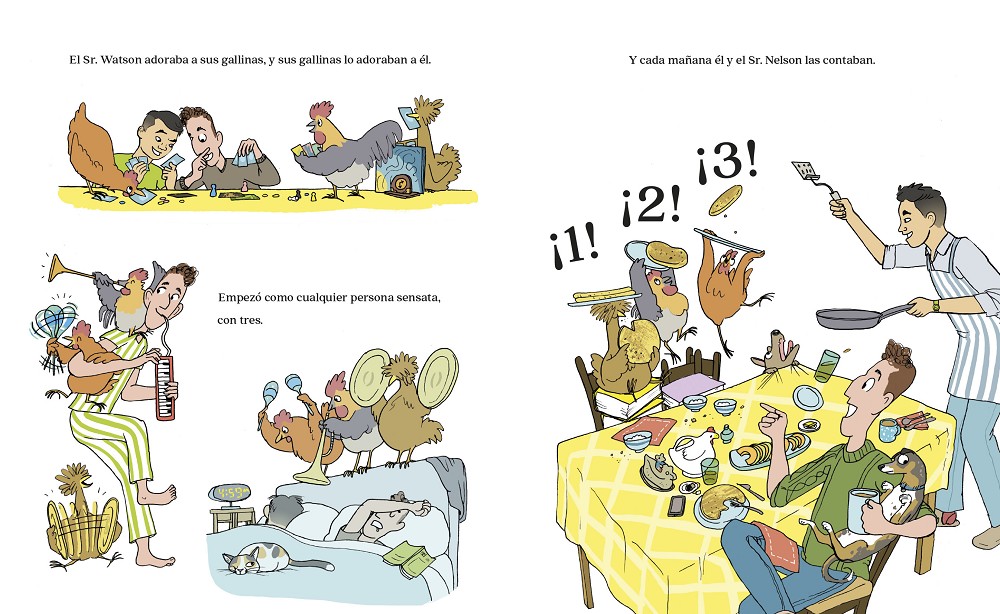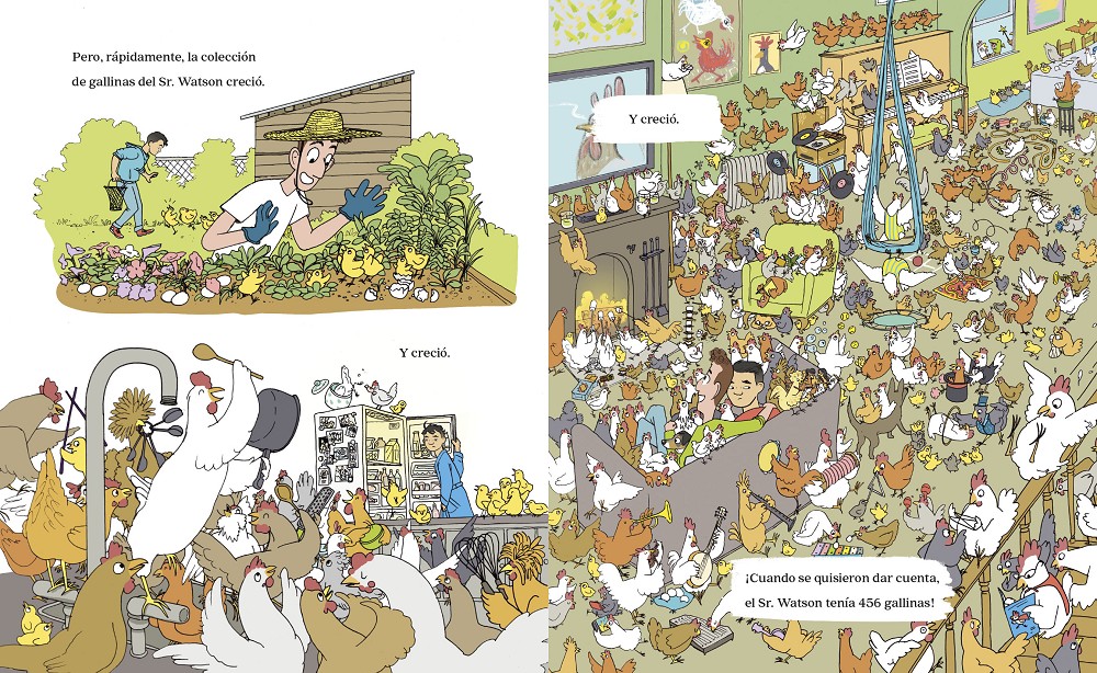Pero la colección de gallinas del Sr. Watson crece. Al final, hay gallinas en el fregadero, en la cama… ¡incluso en el baño! ¿Qué harán con las gallinas? ¿Qué pasa cuando estas se escapan?