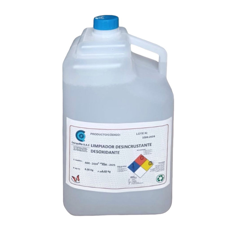 Limpiador desincrustante desoxidanteUSOS ContenedoresDisuelva el DESCALING CLEANER en agua, aplique y deje actuar por periodo de 3 horas, luego enjuagar con abundante agua. HidrolavadorasDisuelva el DESCALING CLEANER en un balde con agua, la toma de agua succionara del balde, votará el agua al mismo balde, haga circular por un periodo de 30 a 60 minutos hasta que note que la solución deja de efervescer. Limpieza por InmersiónSumerja la pieza en la solución, notará que efervece, mantenga la pieza sumergida hasta que la solución deje de actuar, luego enjuague con abundante agua. Enfriadores Calderos Radiadores Para este efecto deberá agregar solución hasta ¼ de la capacidad del tanque, luego dejar actuar la solución hasta que deje de efervecer, luego vacíe el contenedor y enjuague con agua repetidas veces. Incrustaciones de cemento Remover la parte superior del cemento con la ayuda de una espátula, luego aplicar DESCALING CLEANER, dejar actuar hasta que la mancha de cemento desaparezca, luego enjuagar con agua. Limpieza con acumulación calcárea y/o óxido elevado Deje trabajar la solución, hasta que esta termine de efervecer, luego enjuague con agua, si es necesario repita la operación hasta eliminar por completo las acumulaciones.