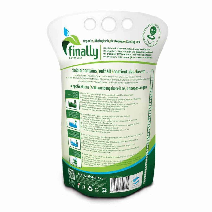Es la alternativa ecológica a los productos para wc químicos que por lo general tiene que utilizarse en caravanas, campings y la industria del ocio marino. La mayoría de los líquidos para baños químicos del mercado utilizan FORMALDEHIDOS o ALDEHIDOS, los cuales están prohibidos en algunos países. Estos químicos acaban en fosas sépticas o vertederos de productos químicos y finalmente en nuestras aguas. Muchos campings de la UE ya están prohibiendo estos productos químicos.