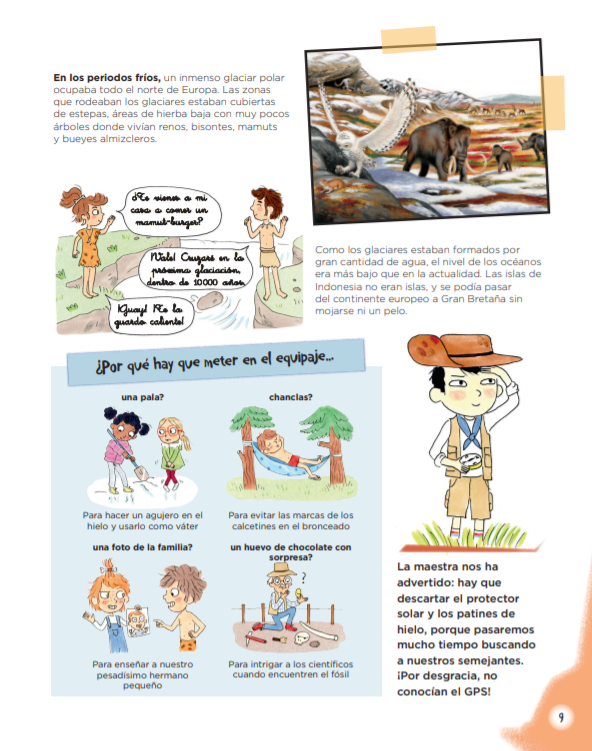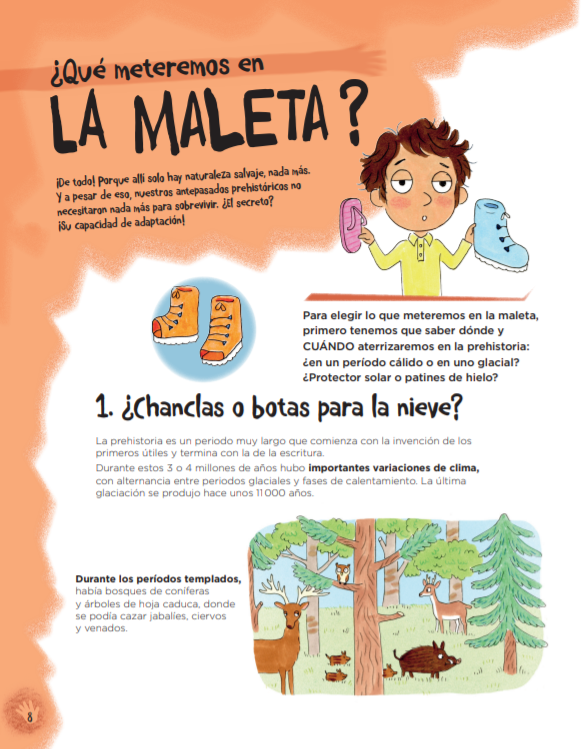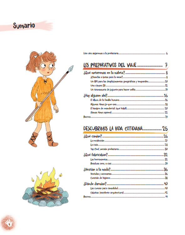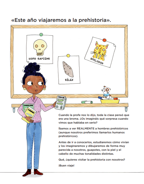 «Cuando la maestra nos ha propuesto ir a la prehistoria a hacer clase, todos hemos pensado que se trataba de una broma. ¡Nadie ha podido retroceder en el tiempo, todavía! ¿Imagináis nuestra sorpresa al comprender que lo decía en serio? Así que nos hemos puesto a estudiar la prehistoria y a preparar este viaje fabuloso. «Un fantástico pretexto para investigar y después compartir lo que hemos aprendido ya sea en forma de cómic, exposiciones delante de la clase, experimentos, etc. Un juego entre el texto de ficción (el relato de un grupo de niños que se hacen preguntas sobre el mundo) y el texto científico que explica cómo era la prehistoria en la realidad. Una combinación perfecta entre las ilustraciones humorísticas de Candela Ferrández y unas magníficas fotos de diversos yacimientos prehistóricos.