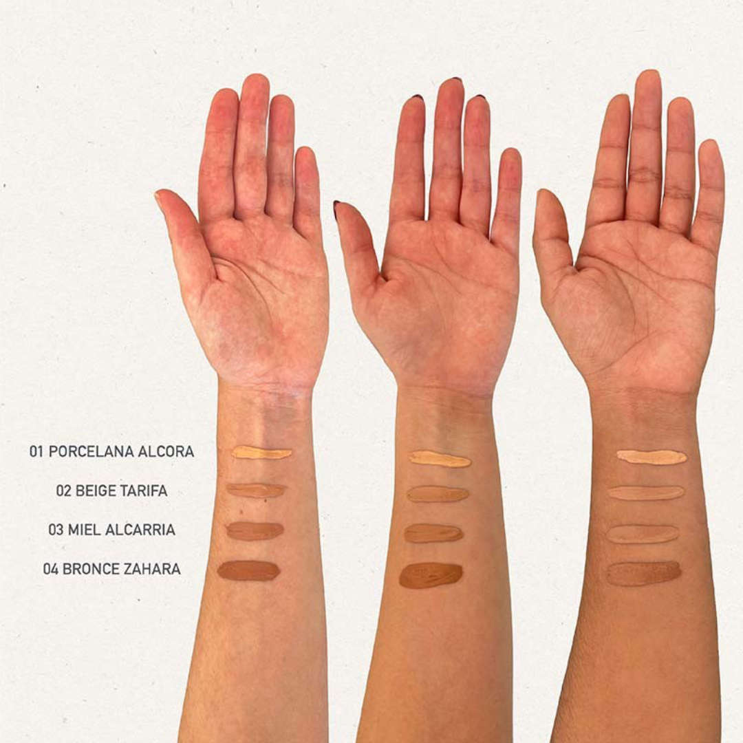 - Pigmentos minerales naturales: Logran una cobertura uniforme y un tono cálido y favorecedor.