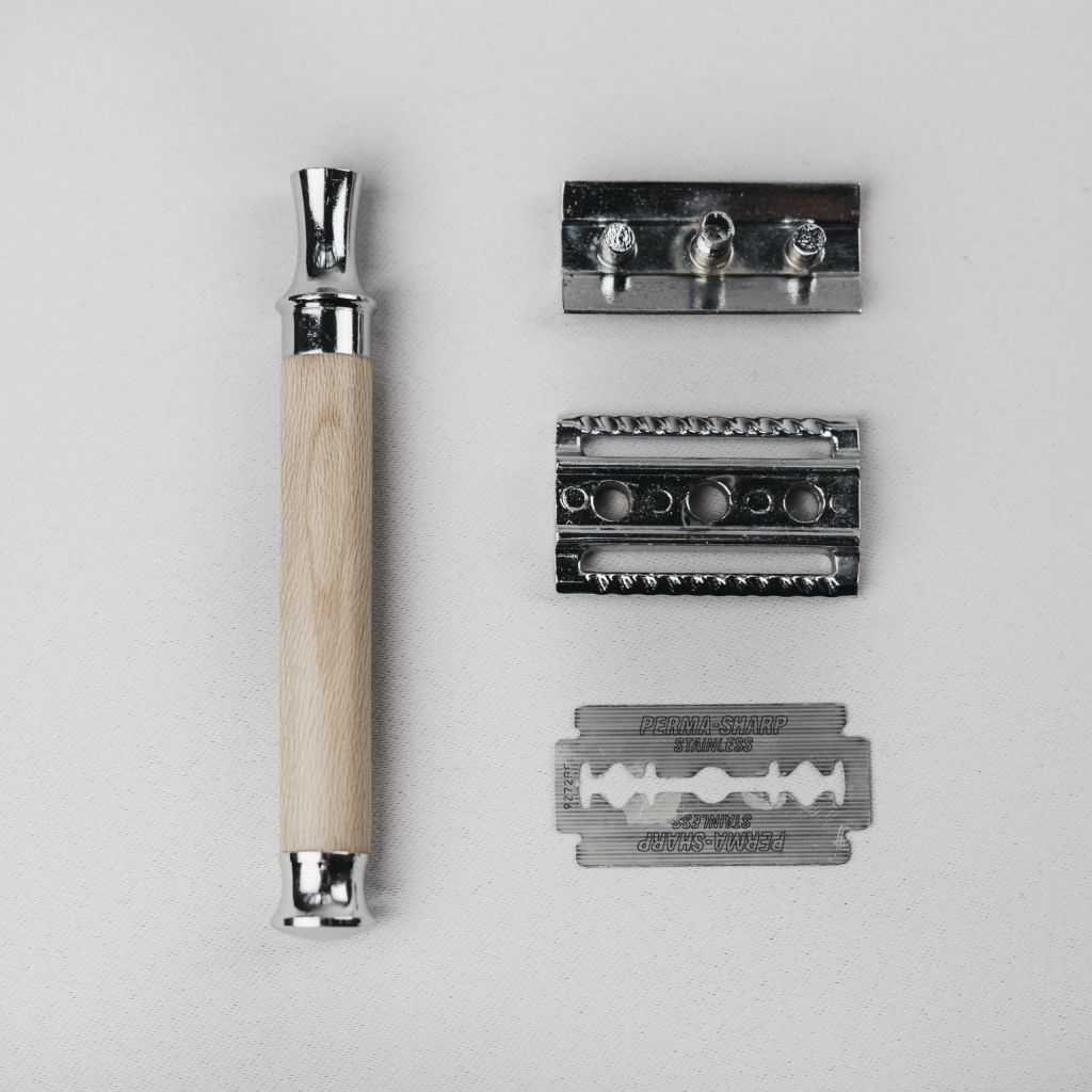 Maquinilla de afeitar con cabezal universal y sistema anticorte de tres piezas