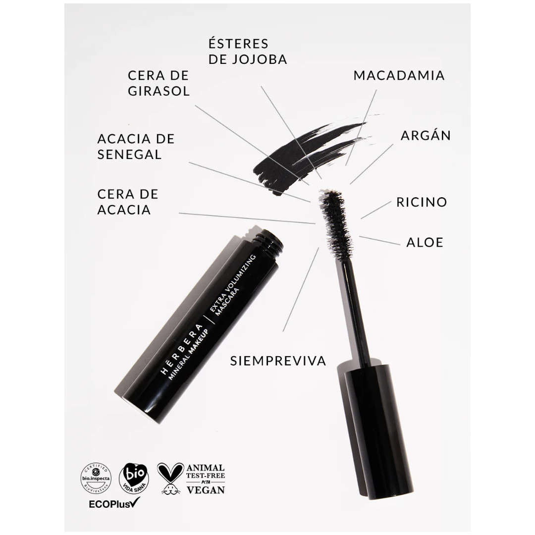 Máscara de pestañas voluminizadora, formulada con argán, ricino y macadamia orgánicos que fortalecen tus pestañas y realzan tu mirada.