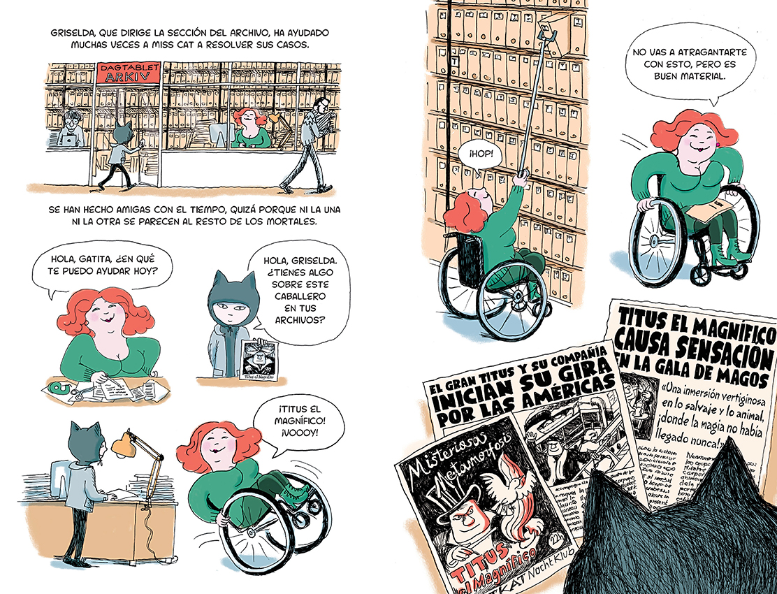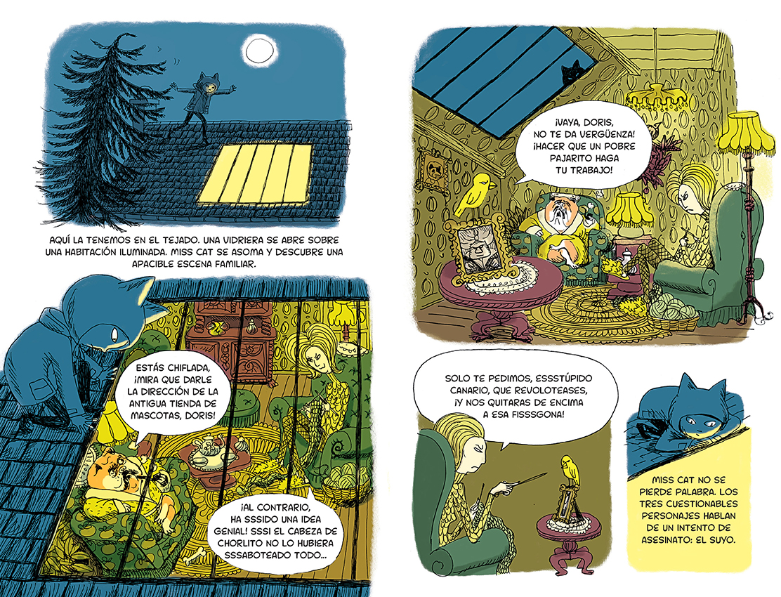 ¿Quién no ha soñado en alguna ocasión con resolver grandes misterios? La joven Miss Cat no necesita fantasear, ¡ella tiene su propia agencia de detectives! Sigilosa y ágil, ningún enigma escapa de su intuición felina. En el primer tomo de esta singular saga de novelas gráficas para los más jóvenes, el anciano Sr. Titula acude al despacho de Miss Cat en busca de ayuda. El caso parece sencillo: Harry, el canario que le regaló su nuera Doris, ha desaparecido. Siguiendo su olfato, la joven detective llega hasta la casa de Doris y Jean-Pøl, un bulldog muy humano. ¡Este es un ovillo bien enredado! Las cosas podrían acabar mal, pero Miss Cat siempre cae de pie. El prestigioso dúo francés Fromental-Jolivet ha creado un cómic de primera línea, con una narrativa secuencial sorprendente y protagonizada por un personaje inteligente, cálido, y sin infantilismo.