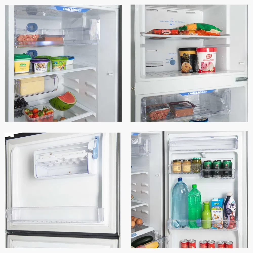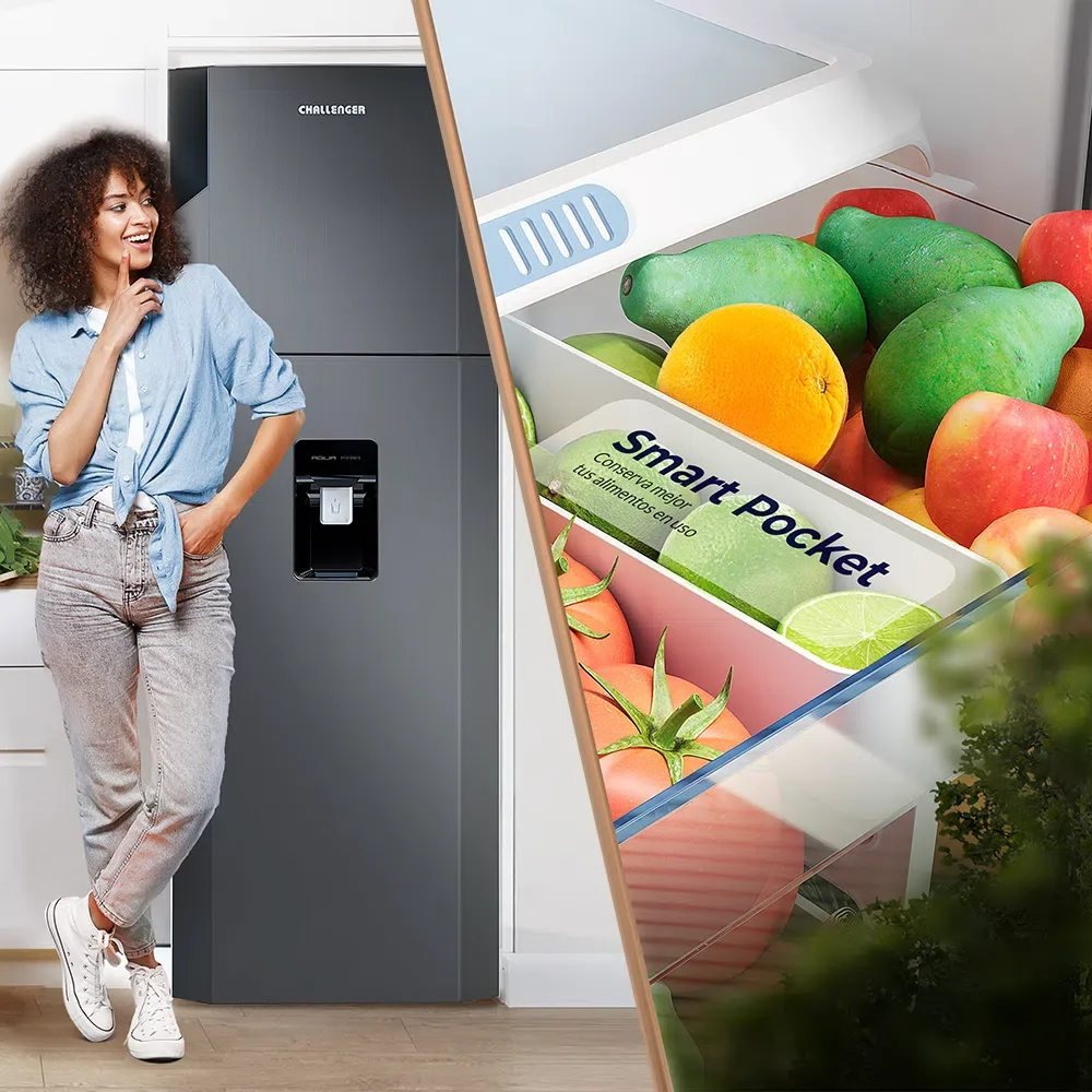 Nevera No Frost de la nueva línea de neveras challenger lúmina, de 290 Litros Brutos de clase tropical de bajo ruido y de bajo consumo energetico, incorpora un sistema multiflujo el cual realiza una distrubición constante y uniforme de la temperatura para matener los alimentos mas frescos con descongelación automática, cuenta con refrigerante R600a que conlleva a una mayor eficiencia energética y reduce el riesgo del impacto sobre el calentamiento global y el daño a la capa de ozono. Incluye un novedoso Smart Pocket en el compartimiento de frutas y verduras pensado para alimentos iniciados.
