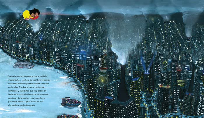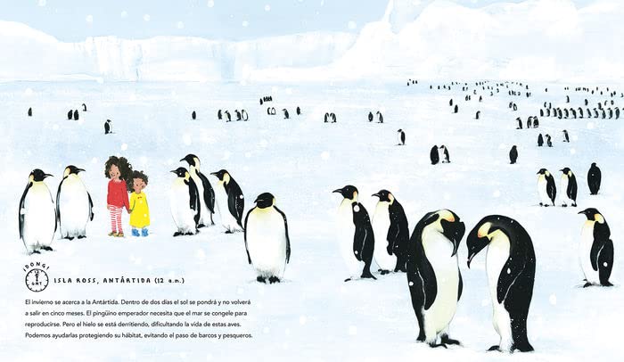Es medianoche en Londres. La ciudad duerme, pero dos niñas están despiertas imaginando qué estará pasando en otras partes del mundo, en ese preciso instante. Imaginan pingüinos en la Antártida, canguros en Australia, ballenas jorobadas en la profundidad del océano, un albatros sobrevolando las olas. Cuando suenan las 12 campanadas que anuncian un nuevo día viajaremos junto a ellas alrededor del mundo para observar especies de todos los tamaños y formas y lo que están haciendo en ese preciso instante.