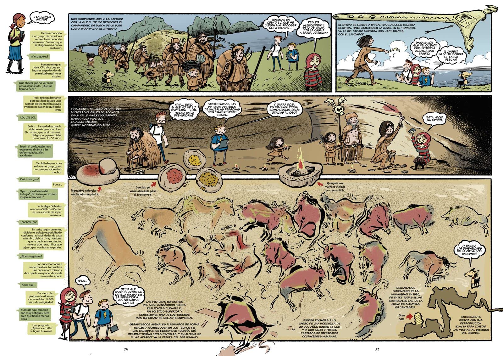 Entre volumen y volumen de Historia del Arte en cómic, Pedro Cifuentes pone a sus agentes de la historieta a transitar por la historia de España, en una nueva colección que promete ser rompedora. En primer lugar, rompedora en lo formal, porque nos liamos la manta a la cabeza y nos vamos a un formato enorme, a libros de 29,7 x 42 cm de tamaño, quizá no lo más cómodo para leer en la cama, pero sin duda inmejorables para deleitarnos con los mil y un detalles que tienen las ilustraciones de Pedro. Y rompedora también en contenido, porque cada volumen de la colección contará con la asesoría de investigadores expertos en el tema en cuestión, para reflejar una historia que huya de apolillados discursos positivistas, de reyes y batallas, y que explique los procesos de fondo y otorgue su parte a los individuos habitualmente olvidados y olvidadas por la historia: la mujer, la infancia, los subalternos, los excluidos… Este primer volumen estará dedicado a la prehistoria, desde la hominización a la Edad de Bronce, y entreteje el discurso cronológico con la explicación de los procesos de cambio que acontecen a lo largo de tantos milenios, para responder a cuestiones como qué es lo que nos hace humanos, el nacimiento del pensamiento simbólico, el origen y expansión de los mitos, la aparición de las desigualdades y las jerarquías, etc. Los principales yacimientos de nuestro país –de Atapuerca y Altamira al Argar o los Millares– y las piezas arqueológicas más destacadas se ponen de relieve. ¡Un cómic que marcará una época!