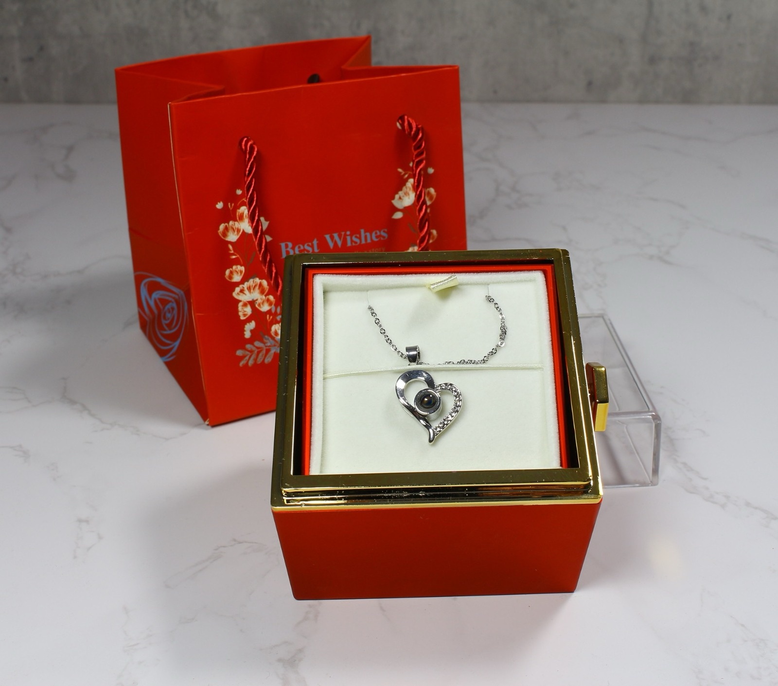 Rosa Eterna Roja con Gargantilla ‘Te Quiero’ en 100 Idiomas – Caja Giratoria con gargantilla y Bolsa de Regalo (9x9x9 cm)