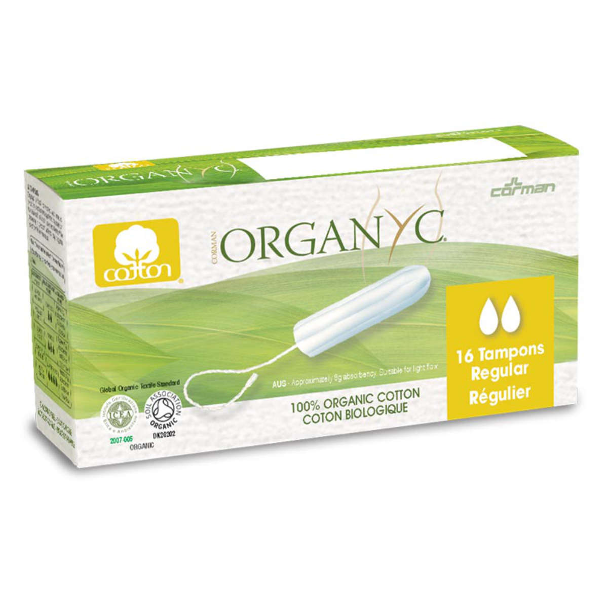 Tampones fabricados en algodón 100% orgánico para una absorción regular.