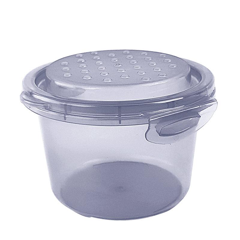 Tazón Dots redondo transparente de 2 tazas o 500 mililitros. Este hermético plástico es un recipiente especial para almacenar alimentos. Con tapadera que sella a presión, texturizada con puntos. Se puede usar en microondas. Libre de BPA (BPA Free). Se puede lavar en lavatrastos.
