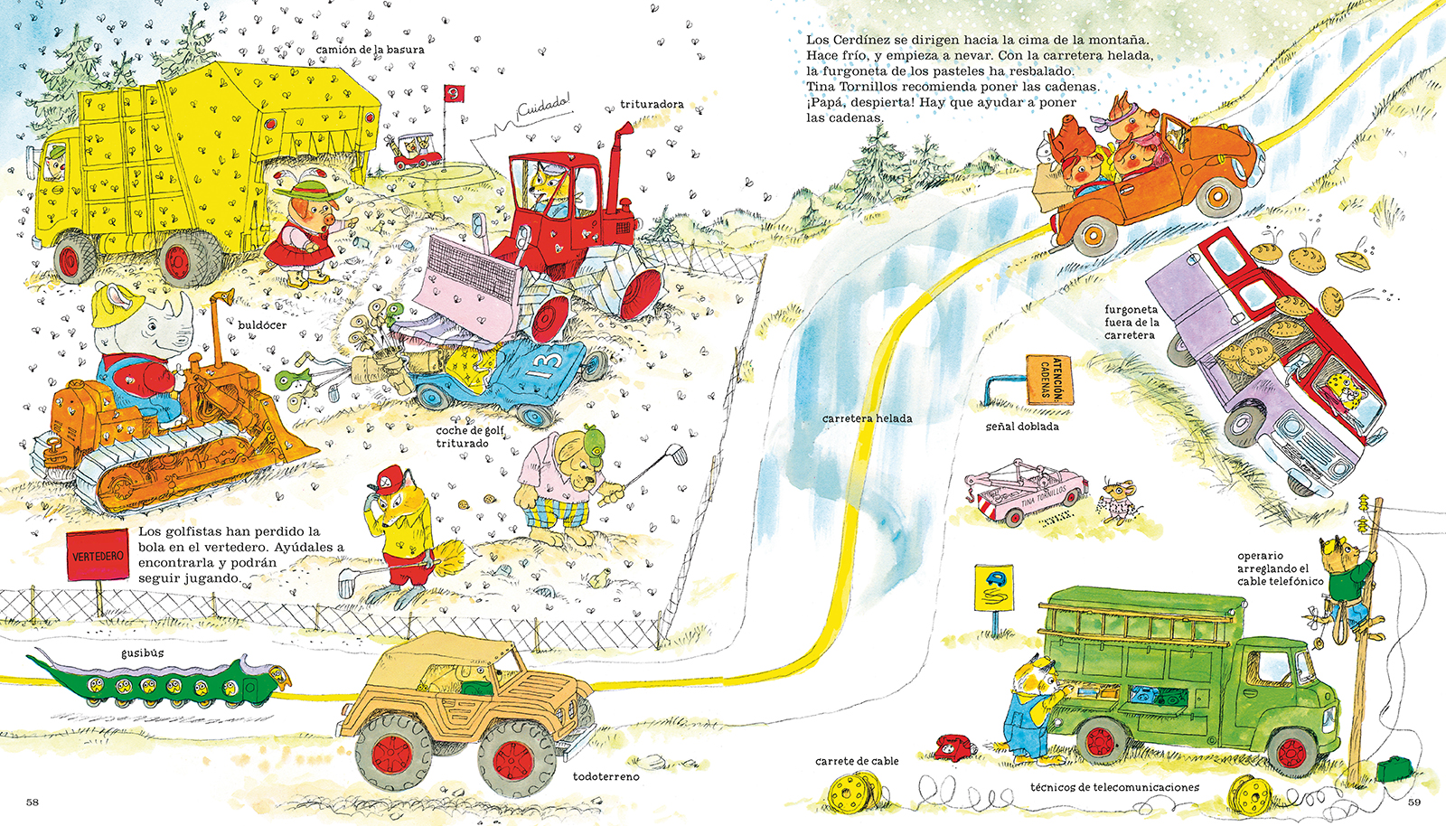 Coches, tractores, aviones, grúas, autobuses… pero también furgotellas, bichobuses, caimanautos y un circo sobre ruedas: ¡cuántos vehículos encontrará la familia Cerdínez en la carretera! ¿A qué esperas? Empieza a pedalear y viaja con ellos. Cada dibujo de este libro nos explica con alegría y fantasía inacabables el mágico mundo de los medios de transporte.