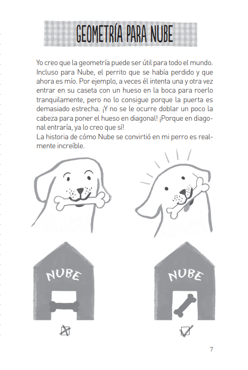 «Yo creo que la geometría puede ser útil para todo el mundo. Incluso para Nube, mi perrito. Por ejemplo, a veces él intenta una y otra vez entraren su caseta con un hueso en la boca, pero no lo consigue porque la puerta es demasiado estrecha. ¡Y no se le ocurre doblar un poco la cabeza para poner el hueso en diagonal! ¡Porque en diagonal entraría, ya lo creo que sí!»Si leemos las aventuras del joven protagonista de este libro, al que acompaña su nuevo e inseparable amigo de cuatro patas, podremos acercarnos y llegar a entender el fascinante mundo de la geometría.