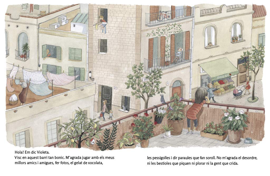 ¡Hola! Sóc la Violeta. Tinc un gos juganer que es diu Raspall. Amb els meus amics i amigues estem preparant una festa al barri. Aquí hi viuen famílies ben diferents. Però una cosa ens fa iguals: tots ens ajudem i ens estimem. Som una gran família! Ens hi acompanyes?