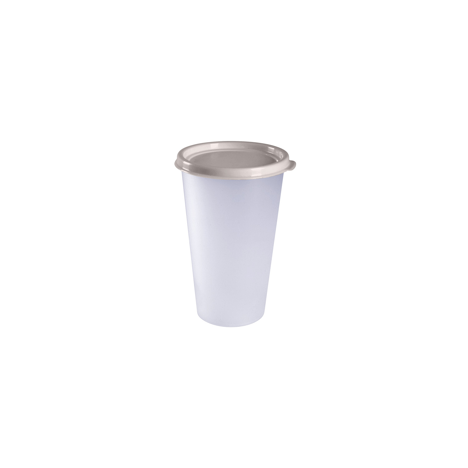 Este hermético plástico es un vaso que permite llevar líquidos sin ser derramados. Cuenta tapadera que sella a presión.