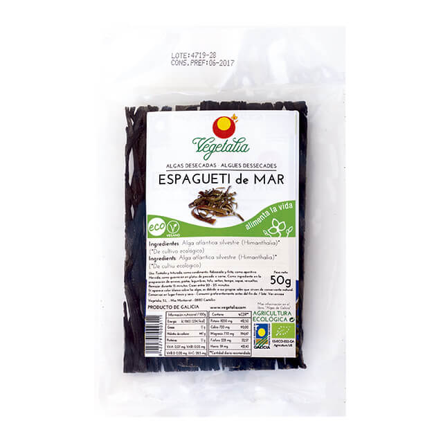 Las Algas Desecadas Espagueti de Mar Eco Vegetalia son un producto dedicado a los amantes de la alimentación saludable y ecológica. Proceden de agricultura ecológica y cuentan con la certificación correspondiente de los organismos reguladores, además de tener el sello de garantía de la comunidad autónoma gallega. Estas algas desecadas tienen como característica su bajo contenido en sodio, el cual ayuda a disminuir el volumen de líquidos en el organismo. Esta característica, unida a su licuencia, hace de estas algas desecadas un producto único y de gran calidad.
