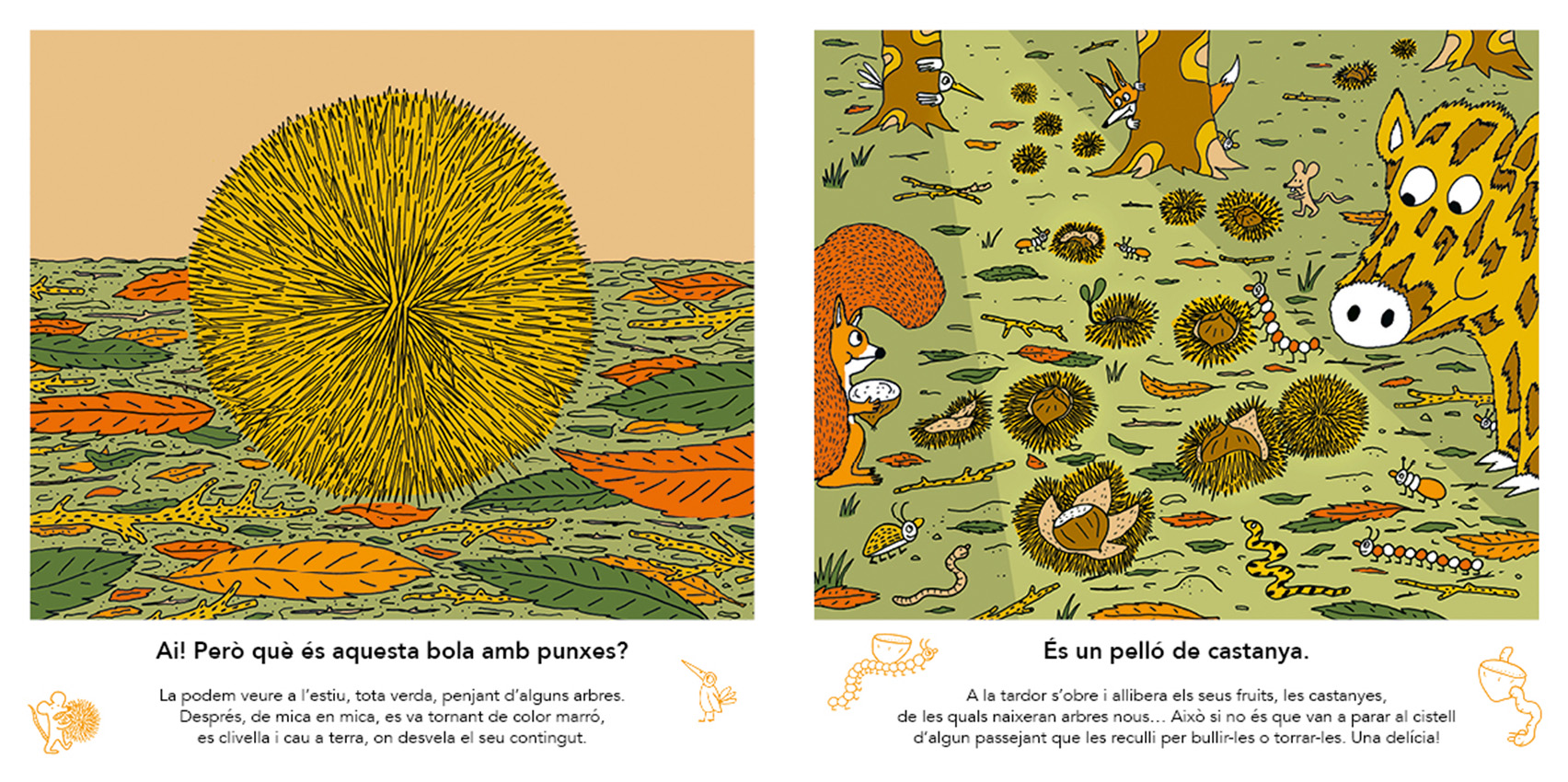 Corre! Obre el llibre i afronta’t al repte de resoldre més de quaranta endevinalles sobre tot allò que s’amaga, camufla i sorprèn de l’entorn natural. En la part esquerra de cada doble pàgina trobaràs enigmàtiques figures (i alguna pista) que posaran a prova tots els teus coneixements. Per sort, la informació de la part dreta t’ajudarà a entendre el que estàs contemplant amb senzilles explicacions.