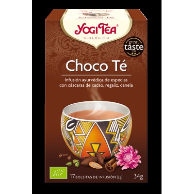 Choco Té de Yogi Tea es una mezcla única y con sabor divino para los amantes de los tés. Esta mezcla específica combina los sabores tradicionales del chai con la cáscara de cacao. Al unir el regaliz dulce, la canela, el jengibre picante y el cardamomo, se crea una mezcla celestial de sabor. Esta infusión se puede disfrutar como una deliciosa indulgencia.
